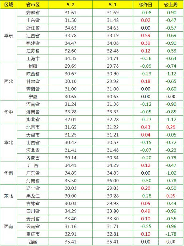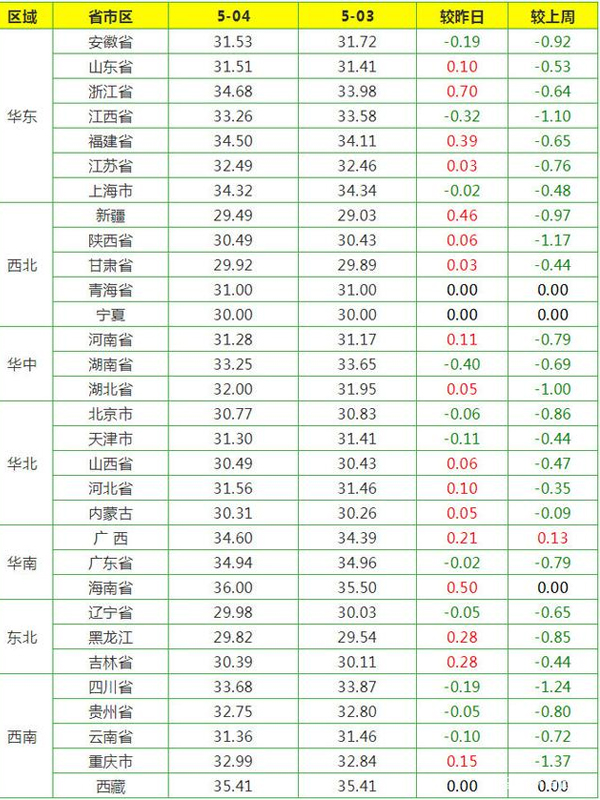 - 從監(jiān)測(cè)到的數(shù)據(jù)來(lái)看,5月3日全國(guó)各地區(qū)外三元生豬的平均價(jià)格一片“紅色”,細(xì)數(shù)一看,16個(gè)省市呈現(xiàn)上漲狀態(tài)!雖然整體均價(jià)還是下跌的,但是已經(jīng)明顯看到下滑的趨勢(shì)越來(lái)越緩了。