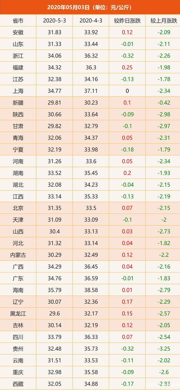 - 2020-05-03 今日全國(guó)外三元生豬價(jià)格,14跌16漲!