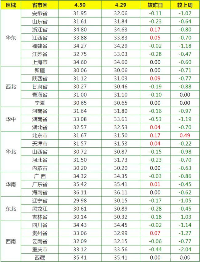 - 4月30日全國(guó)外三元生豬價(jià)格均價(jià)32.43元/公斤,較昨日每公斤下跌了0.13元,較上周同期每公斤下跌了0.77元,較上月同期每公斤下跌了2.13元。隨著氣溫的升高,進(jìn)入肉類消費(fèi)淡季,消