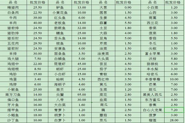表中數(shù)據(jù),豆角、黃瓜、藕價(jià)格小幅下降;西紅柿、菜花、茭瓜、小白菜、茼蒿、西蘭花、菠菜價(jià)格小幅上漲。