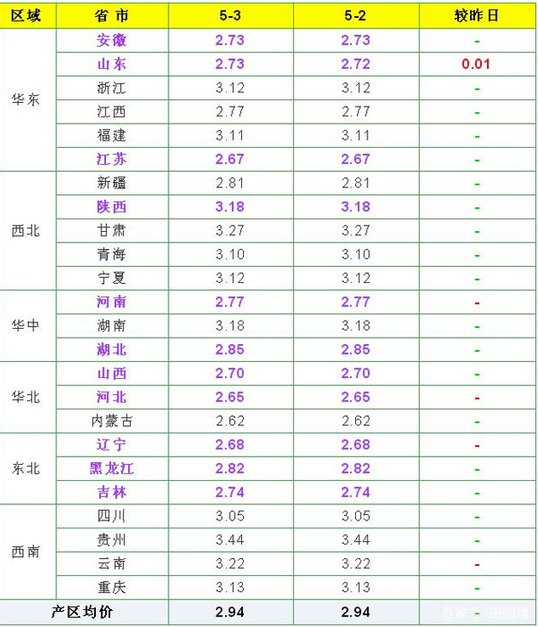 今日主產區雞蛋均價2.77元/斤,較昨日基本持平;主銷區雞蛋均價2.88元,較昨日下跌0.02元/斤;主要批發市場雞蛋均價3.3元/斤,較昨日基本持平。 全國雞蛋價格基本保持穩定,只有個別地區蛋價小幅上調。具體出場價情況詳參下圖(單位為:元/斤,紫色為主產區):